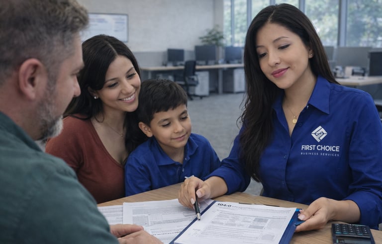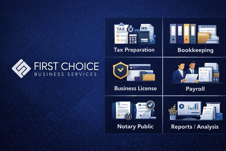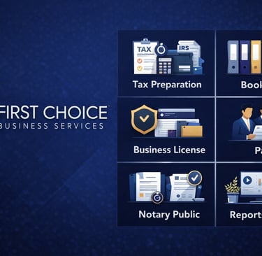 At First Choice Business Services, we help individuals and businesses navigate their fiscal and administrative responsibilities with precision and care. Our integrated services ensure compliance, organization, and peace of mind.